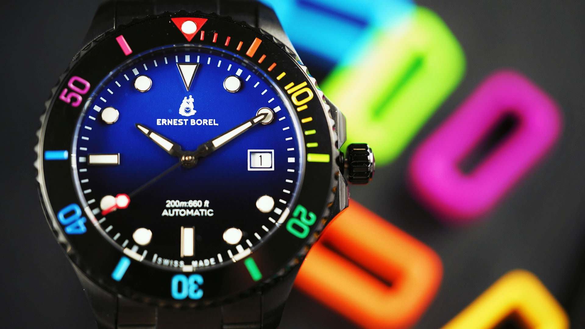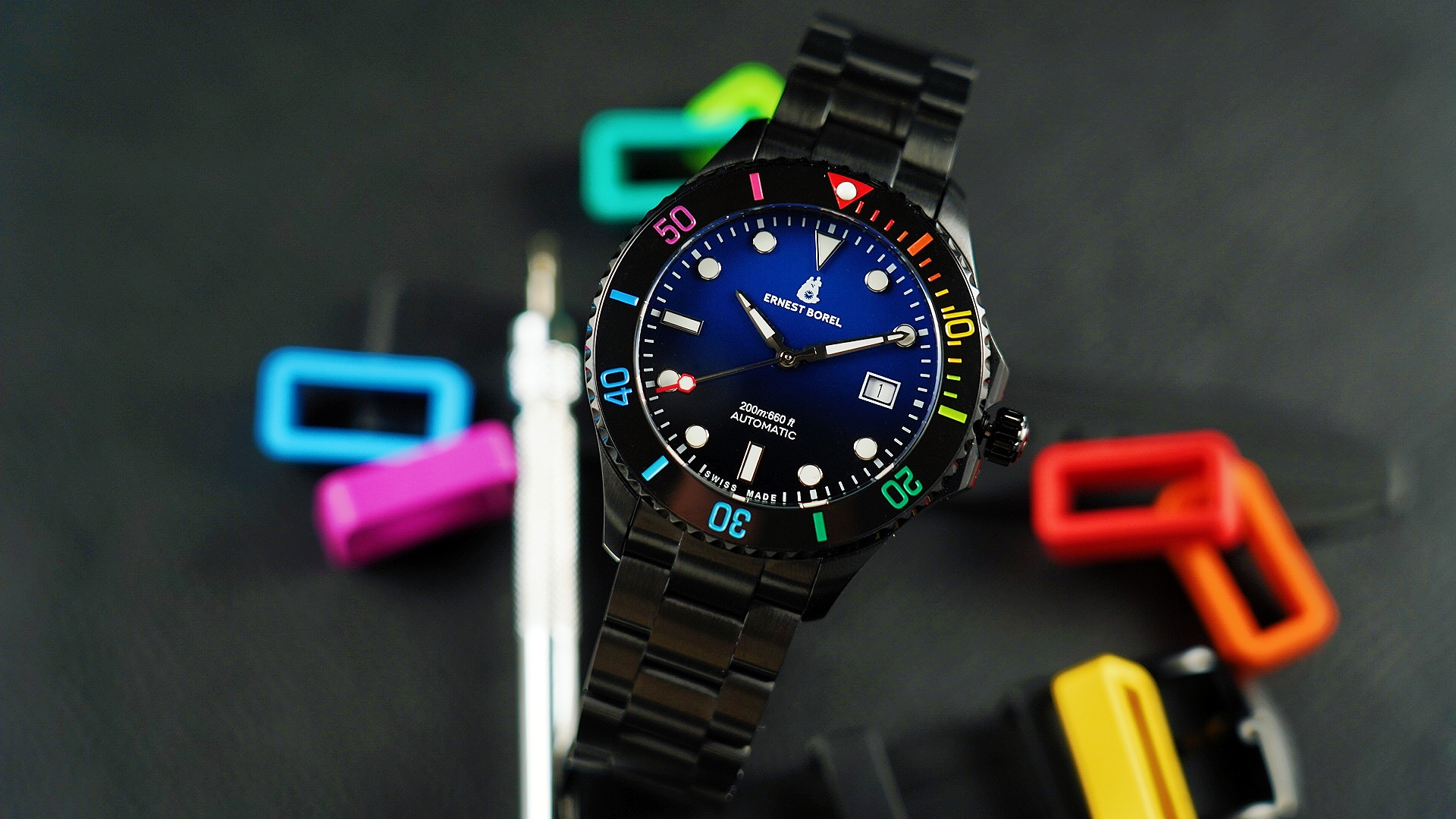 Borel 依波路睿智系列「櫛水母」DLC黑鋼彩虹陶瓷圈 200米潛水男士自動機械手錶 N0735G0E-MZ6W