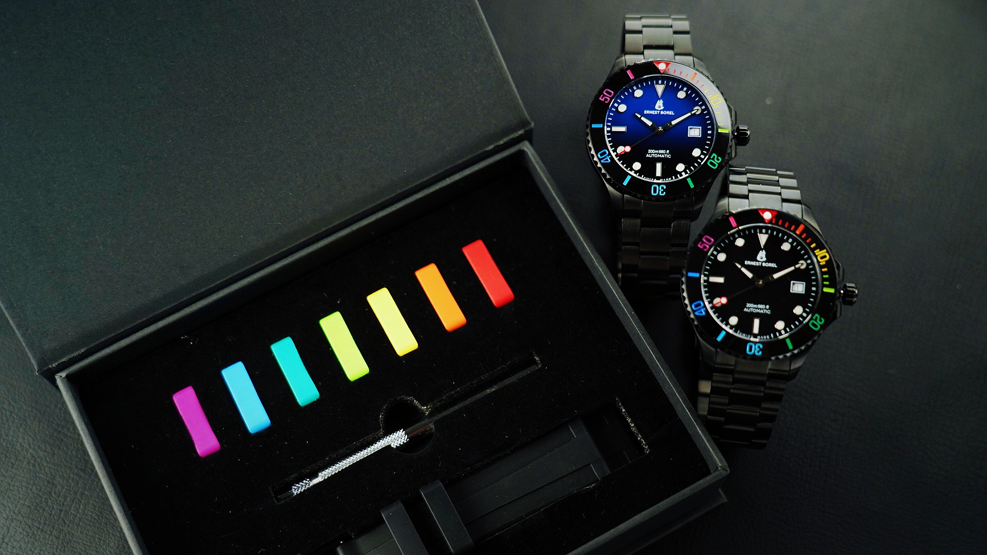 隨錶附送黑色橡膠錶帶一條+改帶工具+彩虹七色橡膠錶圈一套